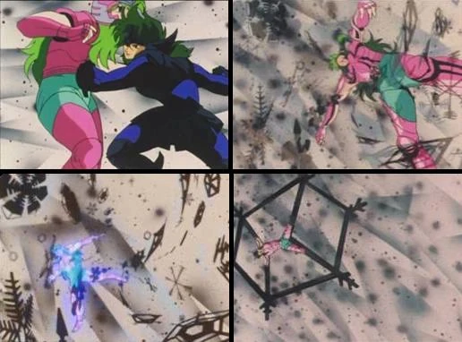 Hyōga rompe el hielo sin problemas, por lo que Cisne Negro se sorprende de cómo logró liberarse con tanta felicidad, a lo que el Bronze Saint responde que no será tan fácil congelarlo a él como congelar el fuego, y prosigue a atacar al Black Saint con el Diamond Dust. Cisne Negro consigue esquivar gran parte del ataque, pero aún así su pierna derecha resulta congelada.