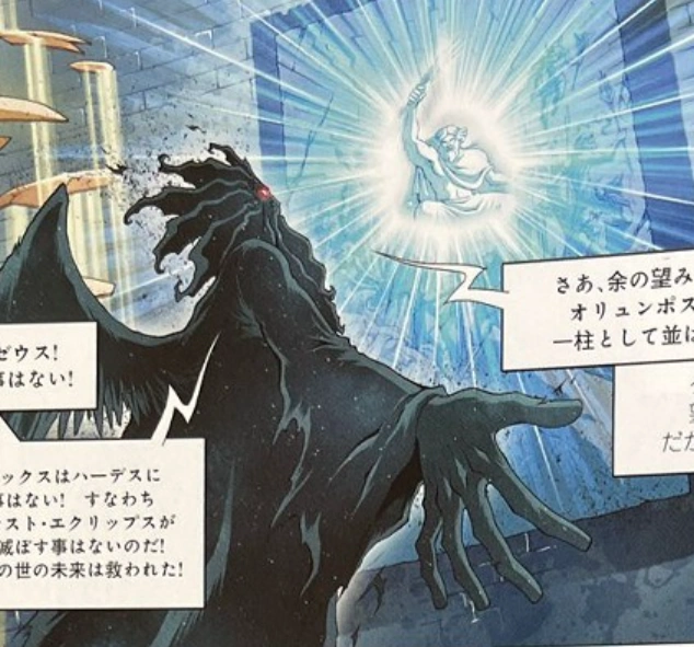Tras contemplar que la Moiras habían cumplido su misión y de haberle borrado la memoria a Ikki. Chronos se encuentra conversando con Zeus a quien le dice que puede dejar de preocuparse pues ha evitado que Ikki se convierta en el huésped de Hades, por lo que el Greatest Eclipse no se dará, salvando tanto a la Tierra, como al mundo de los Dioses.