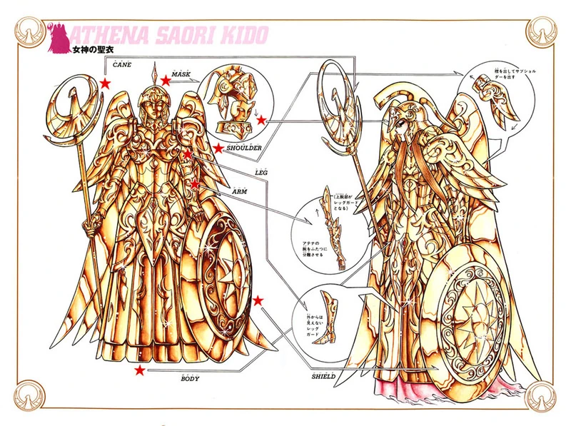 La Armadura de Atenea es la Cloth más poderosa de todas y pertenece a la Diosa de la Guerra, Athena, durante una Guerra Santa. Esta armadura generalmente se encuentra escondida en forma de la Estatua de Atenea en el Santuario de Grecia y sólo puede ser liberada si la misma es rociada con la sangre de la Diosa. De esa forma, la estatua se reduce al tamaño casi de una mano, para poder ser transportada con facilidad hasta donde se encontrase la Diosa.