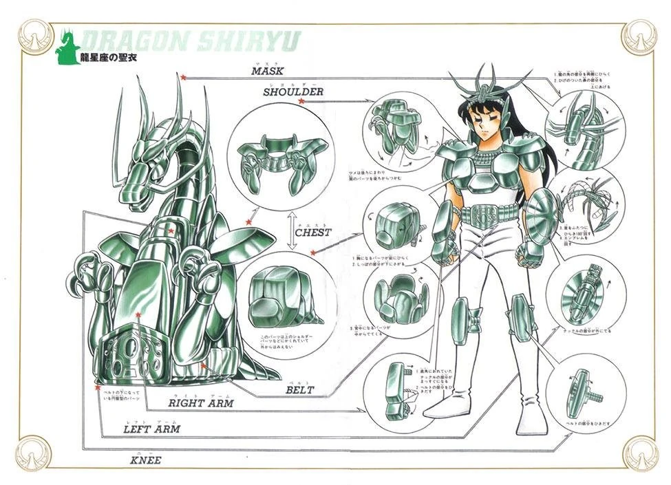 La típica primera armadura del manga de Masami Kurumada, sencilla y ligera a pesar de la robustez que se aprecia en su formo object. Al ser endonsada por el Saint incluye pocas corazas, en su mayoría con algunos rectos, la pieza más gruesa se centra en la protección de los hombros, pecho y espalda, mientras el casco es tipo diadema con un emblema en forma de Dragón en la frente que apenas cubre la cabeza, la armadura ademas incluye dos brazaletes, llevando el izquierdo acoplado el famoso escudo circular, un cinturón simple y dos rodilleras hexagonales.