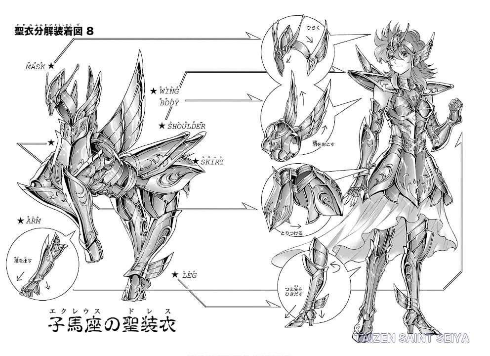 los brazos posee una protección completa hasta los codos, similar a la protección de los pies, en ambas protecciones se encuentran estructura en cuyo centro se encuentran una especie de gema, en los muslos posee una protección “simple”, en la cintura posee dos protecciones laterales, un protección central, y un protector trasero con la “cola” del caballo ubicada en la parte de atrás. El usuario utiliza unos vendajes en los antebrazos, al estilo de Seiya y Shiryū usando sus Final Cloth en la Saga de Hades.