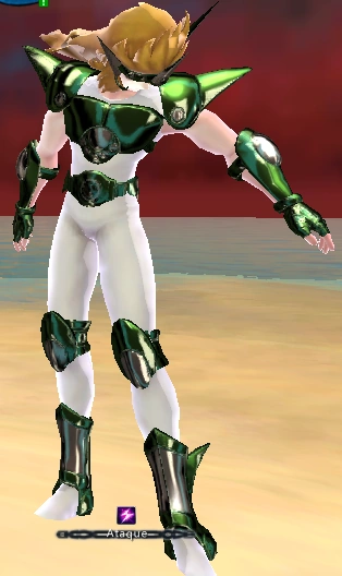 La armadura es exactamente igual a la del manga, pero la diferencia es que esta es de color verde pino con algunas partes plateadas.