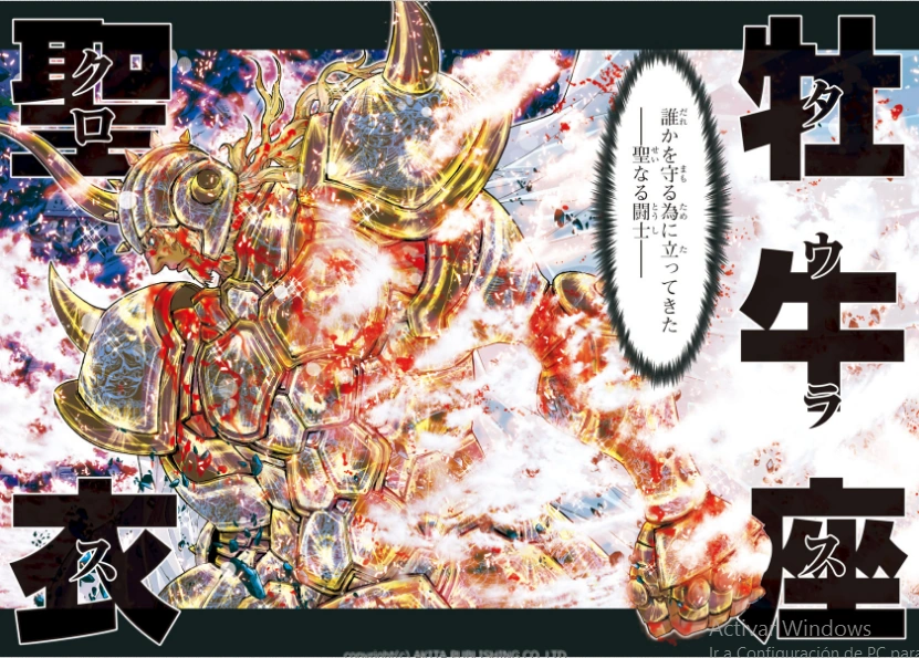 Taurus Cloth (Manto de Tauro). A primera vista, la estructura externa de esta armadura recuerda a un tanque blindado o a un gran rinoceronte, en hombreras y codales sobresalen imponentes y gruesas puntas, el yelmo integral luce los dos cuernos curvos clásicos del toro, en una posición ideal para que el caballero embista con ellos a su enemigo, y en el