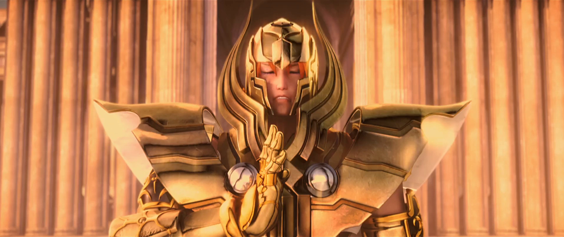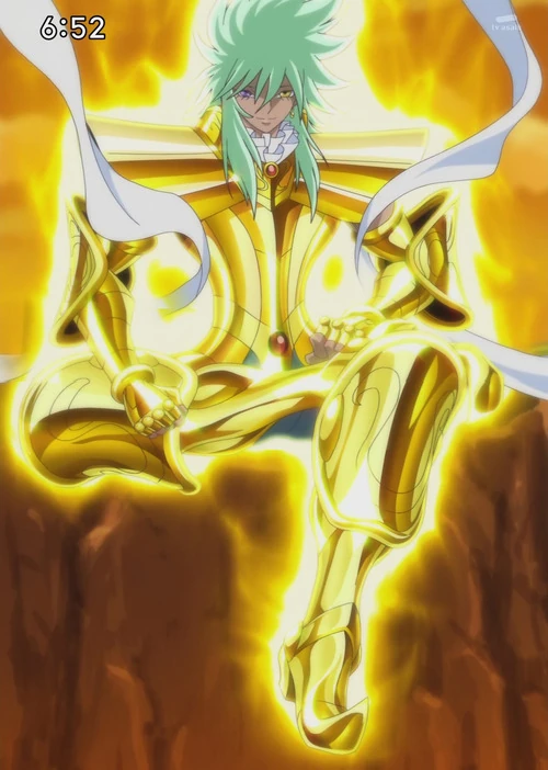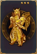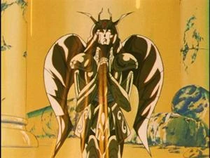 manga clásico y un único tinte amarillento. Además de las diferencias presentes entre manga y anime, han sido ampliadas las placas de la cintura, dando al caballero un aspecto más robusto, y parece que se ha añadido una capa interior con el borde circular uniforme como el de una falda. Las rodilleras y los protectores de los bíceps parecen haber sido ligeramente ampliados. Incluso el tótem se ha modificado, las alas de la espalda son mucho más largas y se extienden lateralmente trazando una especie de corazón.