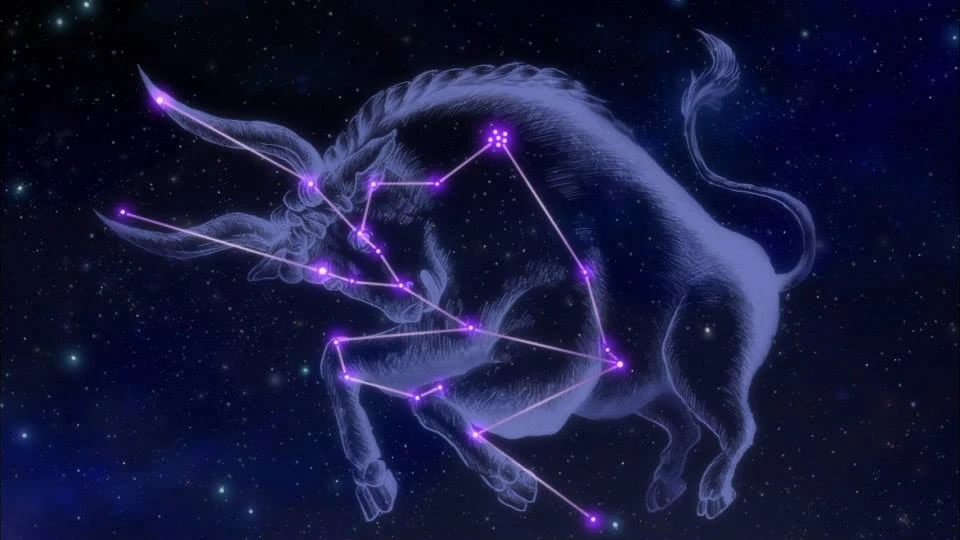 Taurus es la segunda constelación zodiacal es una de las figuras más impresionantes del cielo nórdico por el gran número de estrellas que la componen, entre las que se encuentran las Pléyades y las Híades. Tauro está situada al noroeste del gigante Orión, y al sudoeste de Auriga; su estrella más brillante, Aldebarán (llamado también el ojo rojo del toro), la hace inmediatamente identificable. Esta estrella está muy próxima al grupo abierto que conforman las Híades, la formación de la cara del animal. Nuestra imagen convencional de Tauro es la de una figura incompleta que sólo incluye la mitad anterior del animal, orientada hacia el este y con una cabeza coronada por unos cuernos exageradamente largos, que señalan hacia Orión. La punta de cuerno más alto toca el talón de Auriga, y la estrella que la define había sido compartida antaño por ambas constelaciones.
