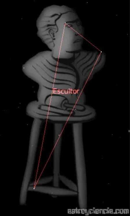 El Escultor, una constelación creada por el abad Nicolás de Lacaille entre 1.751-1.752, es bastante más útil que algunas de las trece creaciones restantes del astrónomo francés, puesto que está ubicada en una zona de estrellas tenues, al este de Piscis Austrinus, que no habían sido bautizadas todavía. A pocos grados al nordeste de la estrella α (4.31; azul-blanca) se encuentra el polo sur galáctico. En un principio, el abad había bautizado esta constelación con el nombre de «el taller del escultor», y algunos mapas de estrellas del siglo XIX contienen variantes en latín de este nombre. En los trópicos o en el hemisferio sur es desde donde mejor se puede observar esta figura, aunque con buenas condiciones de visibilidad se distingue desde posiciones situadas hasta 50° norte. Su punto más álgido tiene lugar el 26 de septiembre.
