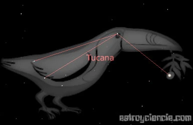 Esta constelación circumpolar del sur fue creada por los navegantes holandeses Pieter Keyser y Frederick de Houtman durante 1595-1597. Se puede localizar fácilmente desde Achernar (Eri), situada al nordeste del Tucán. En la ilustración más antigua que se conserva de la constelación (obra de Johann Bayer, 1572-1625), este pájaro lleva un tallo de planta en su gran pico, señalado por las estrellas α (2.86; naranja; que actualmente representa el pico del ave) y δ. Está posado sobre la Pequeña Nube de Magallanes (PNM). Esta formación es un satélite de la Vía Láctea, situado a 190 000 años luz de distancia. A simple vista parece una mancha con forma de renacuajo. Su longitud es de 3.5°, y unos prismáticos nos revelarán un resplandor en su centro. 47 Tuc (NGC 104) es un cúmulo globular que parece una borrosa estrella de magnitud 4..