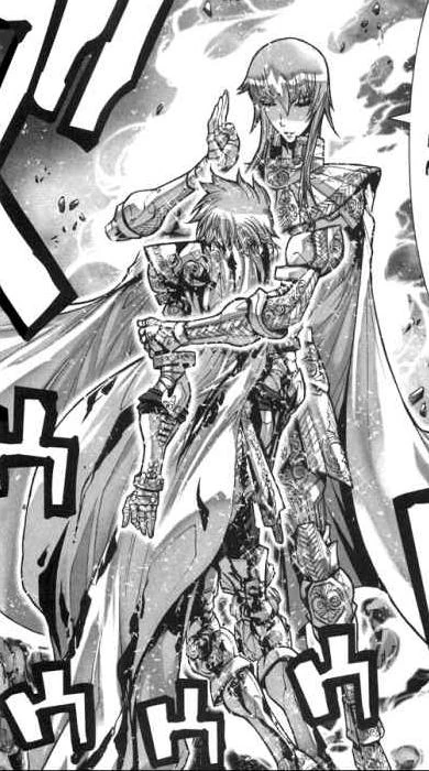 Mientras tanto en el Santuario, Saga hace una interesante explicación de su técnica Galaxian Explosion, indicando que la misma tiene la magnitud de poder de una supernova y también explicita que solo dos caballeros de oro aparte de él tienen esta cantidad de poder: Aioria y Shaka.