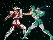 El siguiente combate, Seiya se enfrenta al Santo del Dragón, Shiryū, quien ha entrenado en los Cinco Viejos Picos de China para obtener la armadura de Dragón, para esto tuvo que dominar la técnica del Dragón Ascendente de Rozan, la cual usa para derribar al Santo de Pegaso. Todo parece perdido para Seiya, pero este, recordando a su hermana, se lanza de cabeza contra el Escudo del Dragón, logrando que éste, rompa su puño y escudo, dejando su armadura inservible. Seiya también se quita su armadura y ambos inician un combate a puño limpio.