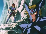 Los desconocidos son dos Santos de Plata, Dante de Cerberus y Capella de Auriga. Hyōga y Shun los enfrentan pero con las cadenas de Cerbero son sujetados cada uno por un pie y arrojados al abismo. En el momento en que todo parece perdido, aparece Ikki el Santo del Fénix. Ikki traza en el suelo una línea y amenaza a los Santos de Plata que si la atraviesan, les costará la vida. Capella, hace caso omiso a la indicación y por ello sufre del ataque del Fénix. Dante se enfrenta al Fénix, pero no es rival. Capella despierta de la alucinación causada por el primer golpe del Fénix, el Puño de Ilusión del Fénix y es muerto mutilado por sus propios discos. Cuando Hyōga y Shun logran salir del abismo en que se encontraban, Ikki se retira del campo de combate. Finalmente Shun lograr derrotar a Dante, quien se había levantado nuevamente.