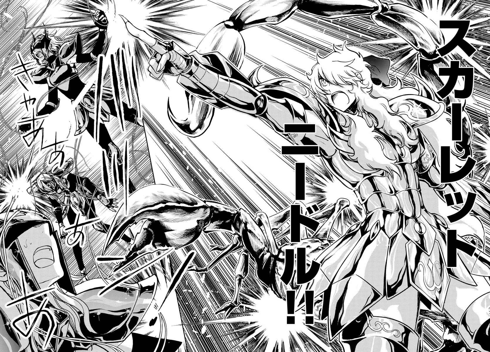 Minos se sorprende al ver que logró herirlo e inmediatamente intenta atraparla con sus hilos. Eulalia reacciona rápidamente y esquiva los hilos con gran destreza y velocidad, aunque uno logra cortarle la mejilla. Este hecho desconcierta a Minos, ya que sus hilos de cosmos deberían ser imperceptibles y, durante las anteriores Guerras Santas, nadie había conseguido evadirlos. Por lo tanto, deduce que los Gold Saints de esta generación han desarrollado contramedidas. Eulalia explica que ha realizado diversas simulaciones para enfrentarse a los Tres Líderes del Inframundo y sonríe al considerarlo digno de enfrentarla. Este gesto provoca que Minos la desafíe a mostrarle su poder, a lo que ella responde atacándolo con la Scarlet Needle, perforando su cuerpo en catorce ocasiones. Mientras su contrincante yace herido en el suelo, Eulalia le explica cómo su técnica le ofrece la oportunidad de rendirse o morir, pero ella no tiene la intención de brindarle esa opción y se prepara para matarlo con la Scarlet Needle: Antares [11].