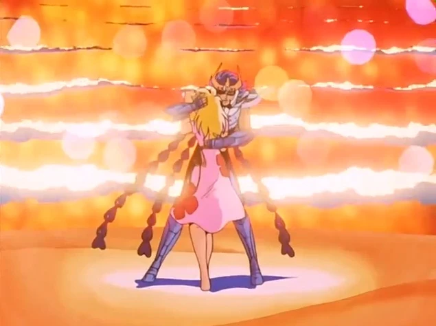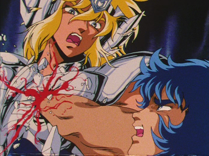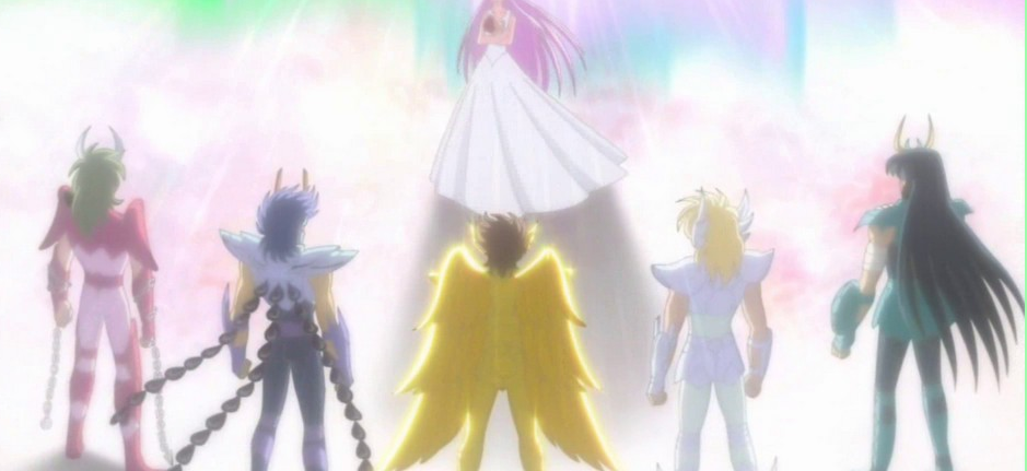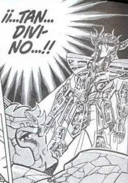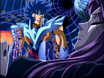 Cuando se sacrifica y va a otra dimensión espacio-tiempo con Shaka en la batalla en la templo de Virgo.