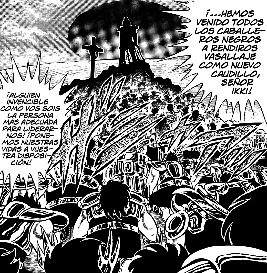 Manga: Ikki reconoce su derrota y lo errado de su comportamiento. Además le revela a Seiya, el origen de los cien huérfanos de la Fundación y la paternidad de Mitsumasa Kido. Tras conocer la verdad, Seiya se compadece de Ikki, pero un derrumbe en el Monte Fuji es provocado por Misty y Mu debe sacar a los Black Saints y de bronce de la montaña, pero Mu afirma que no pudo alcanzar a Ikki con su teletransportación.