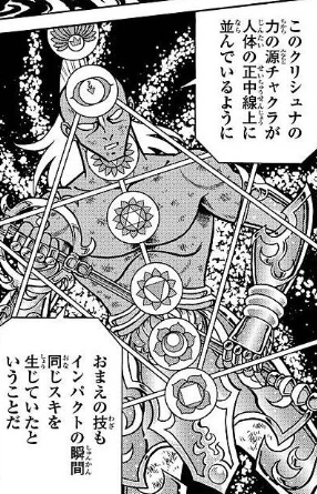 - Barrera de Chakra: Mediante la meditación Krishna se eleva y activa sus siete Chakras para crear una barrera invisible que no puede ser traspasada y que solamente puede ser destruida si dichos Chakras son golpeados al mismo tiempo.
