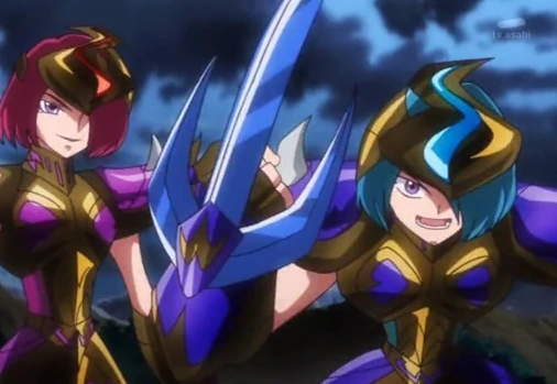 ![]() マックスブリリアントという名のかぎ爪を操る三級パラサイトの姉弟。ユミル(左)が姉でメトネが弟の双子。弟のメトネは姉ユミルに忠実で、常にお姉様と呼び慕う。二人の息のあったコンビネーションから繰り出される爪攻撃で敵を翻弄する。アテナを守る聖闘士を倒す任務を持ち、ジャミールでユナに襲いかかる。(声:戸塚利絵/ユミル、根本幸多/メトネ) |