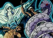 Son serpientes que permanecieron desde la época del mito en el Templo de Ophiuchus tras la expulsión de Asklepios de Ophiuchus del Santuario. Cuando el Templo fue enterrado, permanecieron custodiando en las ruinas el Cloth de Ophiuchus esperando el regreso de su amo. Debido a los siglos transcurridos, perdieron su cuerpo físico y se convirtieron en espíritus que persistieron en el mundo con el único fin de cumplir su misión. Estas serpientes reaparecen en el Santuario como emisarios de Ophiuchus, anunciando la resurrección de Odysseus e intentando que los Gold Saints se unan a él para tomar la cabeza de Athena, pero no todos aceptan unirse a él y varias de las serpientes son destruidas. Una de estas serpientes consigue morder a Saori Kido, inyectándole el veneno de Samael, que se dice que es tan poderoso que puede matar incluso a un dios, lo que pone su vida en grave peligro y la coloca a merced de Ophiuchus, ya que se dice que sólo él puede curar este veneno. Justo cuando Odysseus está a punto de resucitar y el Templo de Ophiuchus se levanta de la tierra, una enorme serpiente dorada aparece en el interior de este lugar, dando la bienvenida a Hyōga que lleva en sus brazos a una Saori afligida por el veneno de Samael. La enorme serpiente devora a Saori para colocarla dentro de un huevo transparente, que retrasará los efectos del veneno, ya que la decisión de salvarla dependerá del Saint de Ophiuchus que estaba a punto de resucitar. Tras esto, la serpiente comienza a enroscarse y del centro de la misma aparece el Cloth de Ophiuchus, dando así por finalizada su misión y desaparece. El resto de las serpientes también desaparecen al ver llegar a Odysseus como el 13º Gold Saint, ya que su misión ha sido cumplida y ahora pueden descansar en paz después de tantos siglos esperando el regreso de su amo. | |