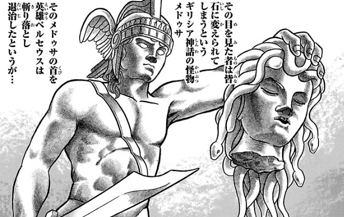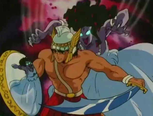 Perseus es mencionado por Shiryū al relatar la leyenda de cómo este héroe derrotó a Medusa. Se describe que, en la mitología griega, Perseus cortó con su espada la cabeza de Medusa, una gorgona cuya mirada era capaz de petrificar, utilizando el reflejo de su escudo para localizarla sin mirarla directamente a los ojos. Después de esto, el héroe tomó la cabeza de Medusa como arma y la utilizó para destruir a un terrorífico monstruo marino.
