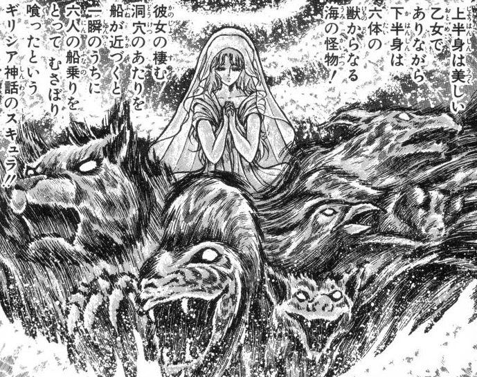 Scylla es mencionada por Shun cuando conoce a Io y observa sus habilidades. Shun explica que, en la mitología griega, se trataba de un monstruo marino con la parte superior del cuerpo de una hermosa doncella y la inferior compuesta por seis bestias. Se decía que, cuando un barco se acercaba a su guarida en las cavernas, atrapaba a los marineros y los devoraba en un instante.