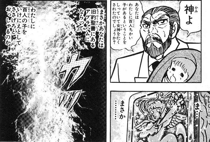Cuando los Bronze Saints se enteran de que Mitsumasa Kido era su padre, le guardan rencor. Sin embargo, Saori Kido les cuenta cómo habían sido realmente las cosas. Según relata, Kido, temeroso, gritaba al cielo: «Dios, ¿cómo puedo ser yo quien cuide de esta niña y del Gold Cloth? Sabes bien que soy un hombre anciano y que me queda poco tiempo de vida… ¿qué puedo hacer yo para continuar la lucha por la justicia? Dios, ¿es que me has encargado a la diosa porque soy el padre de cien hijos? ¡Es imposible! ¿Acaso estás haciendo conmigo lo mismo que hiciste con Abraham en el Antiguo Testamento? ¿Quieres que sacrifique a mis cien hijos en tu nombre?». Estas palabras reflejaban que ese era su destino, al igual que lo fue el del profeta. | |
