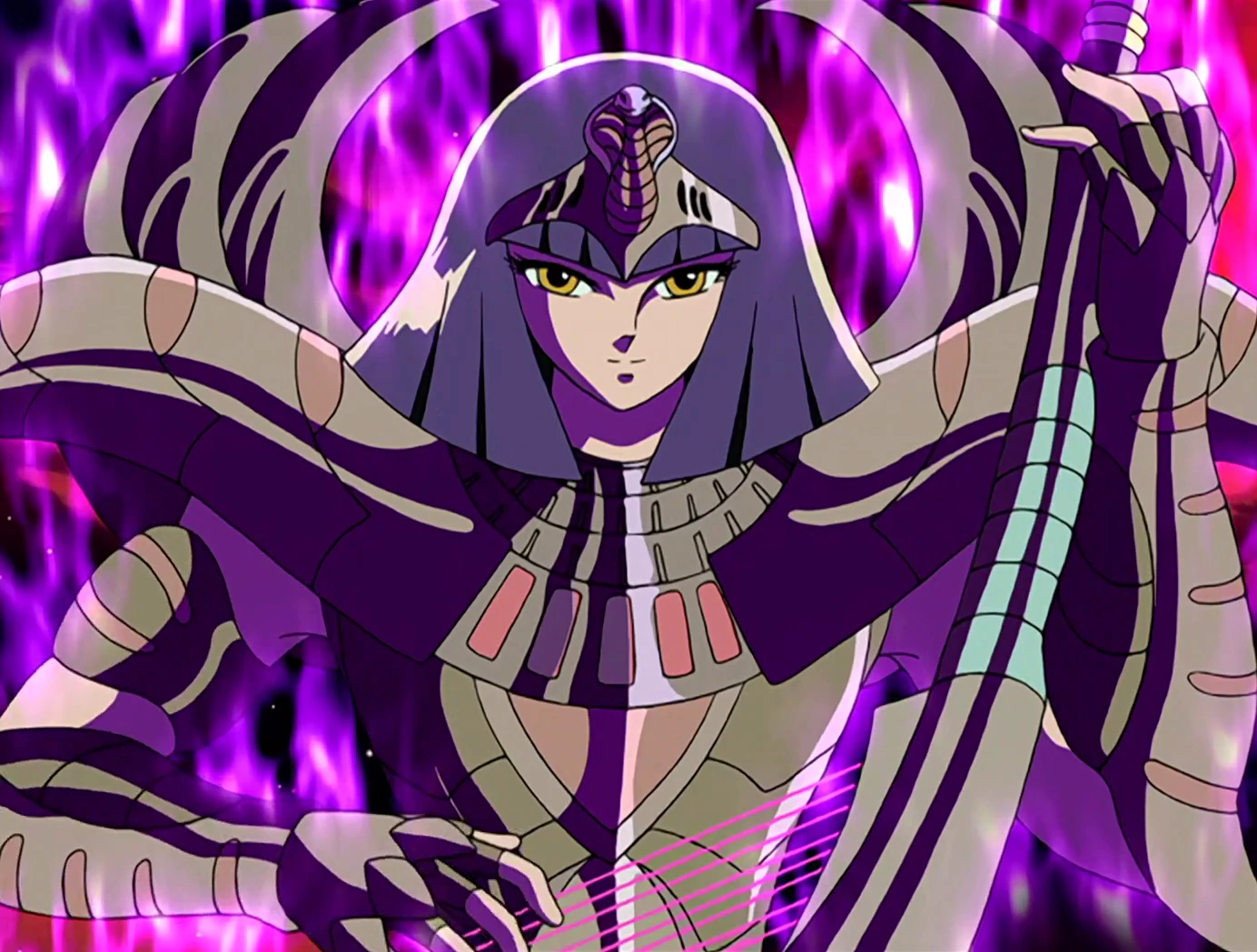 - Su técnica principal "Balance of Curse" está basada en "El Juicio de Osiris" descrita en el "Libro de los Muertos" según las creencias del antiguo Egipto.