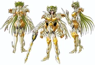 - Cancer: Reflejado principalmente en la diadema, muy semejante a la de la armadura dorada de Cáncer. También se ven patas de cangrejo saliendo de la vasija.