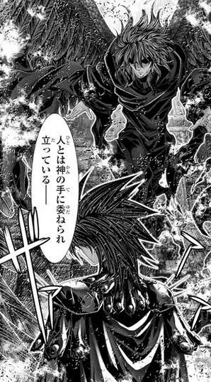 En medio del conflicto contra los Titanes, Saga había poseído la mente de Shura de Capricorn con la técnica Genrōmaōken, convirtiéndolo en demonio. Un incrédulo Saga hablando para sí mismo comienza a decir que su fuerza cada vez más se está pareciendo a la de un verdadero papa al dominar esa técnica, sin embargo una entidad abstracta, este no es otro que la otra personalidad de Saga que aparece en medio de la habitación del papa diciéndole que los Santos no le pertenecen. También le pide a su otro yo que libere a Shura del control del Genrōmaōken. Se produce una pequeña discusión entre ambos, el Santo de Géminis argumenta que nunca seguirá los pasos de Shion. A lo cual su personalidad benevolente le responde que su reinado será algo transitorio, que todo posee un final y su derrota llegará y tras esto le dice que su futuro será el mismo que el de su hermano.