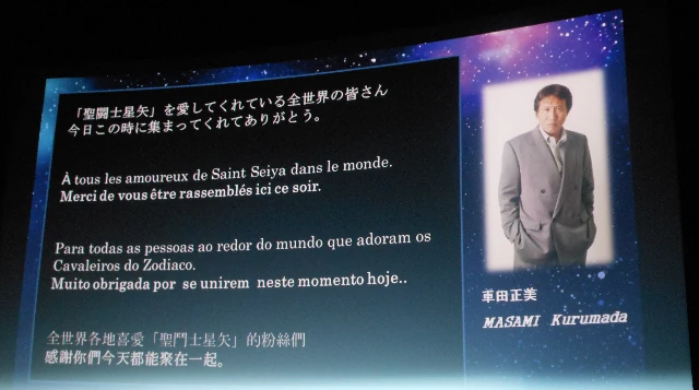 Masami Kurumada en pantalla por el lanzamiento de la serie; "A todas las personas al rededor del mundo que adoran Saint Seiya. Gracias por acompañarnos en este momento, hoy".