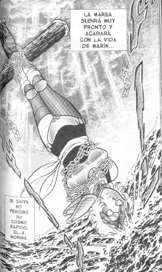 Marin es golpeada por el ataque de Moses de Ballena ayudado por Asterión de Perros de Caza, pero no la matan sino que la atan boca abajo para que la marea crezca y la ahogue, eso sirve de señuelo para que llegue Seiya. Pegaso llega, los Santos de Plata le dicen que ella puede ser su hermana y Seiya lo cree, para ello derrota primero a Moses, luego se enfrenta a Asterion pero Perros de Caza resulta muy fuerte y hábil, sin embargo la misma Marin se libera y salva a Seiya derrotando a Asterión.
