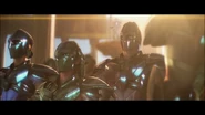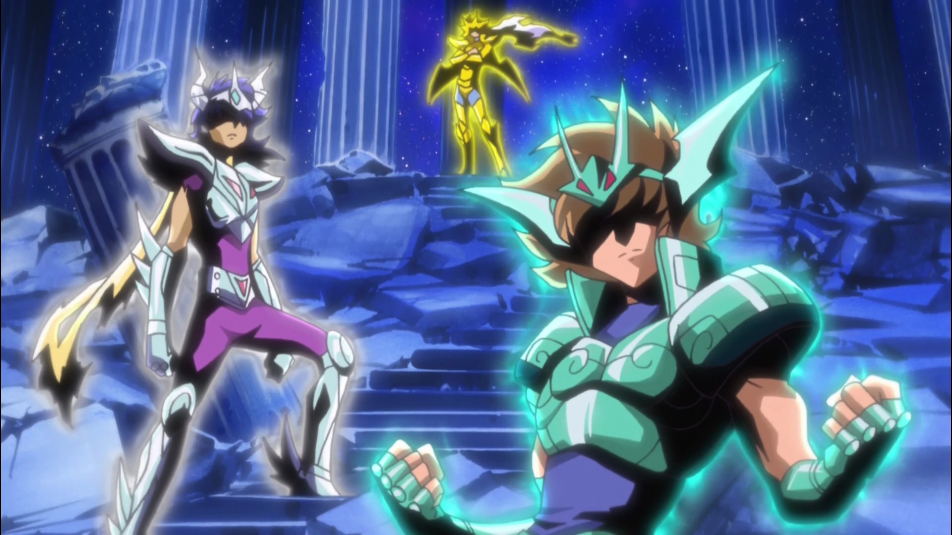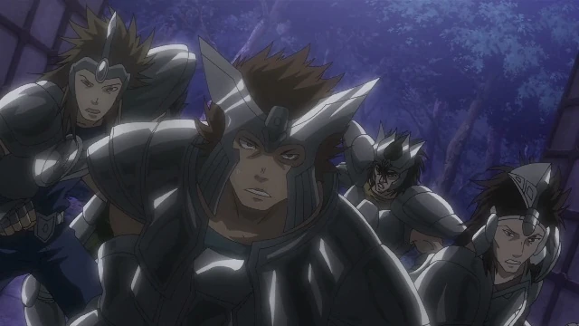 También aparece un grupo de Santo de Bronce algunos de ellos son conocidos en la serie aunque sus armaduras y en algunos el estilo de peinado se ve modificado pero se puede apreciar que estos corresponden a varios Santos de Bronce presentes en el ataque de Dione.