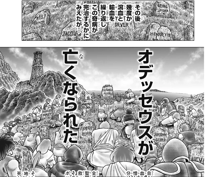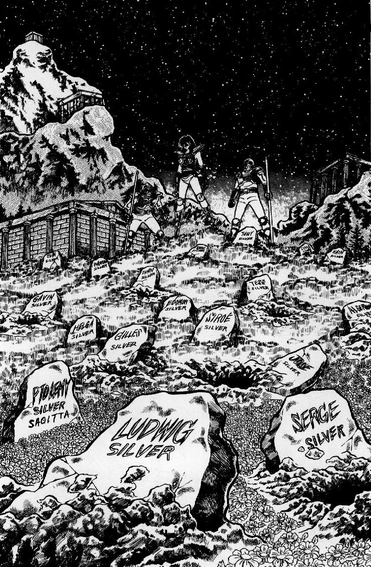 En el capítulo titulado "Sangre dorada" se puede observar varias lápidas de varios Saints, entre ella se encuentra la de Johann, un Silver Saint, cuya tumba ya había aparecido en la Saga de Hades. Además de susodicha lápida se observa la de Odysseus y la de varios Saints de Plata y Bronze entre las que se encuentran las siguientes: