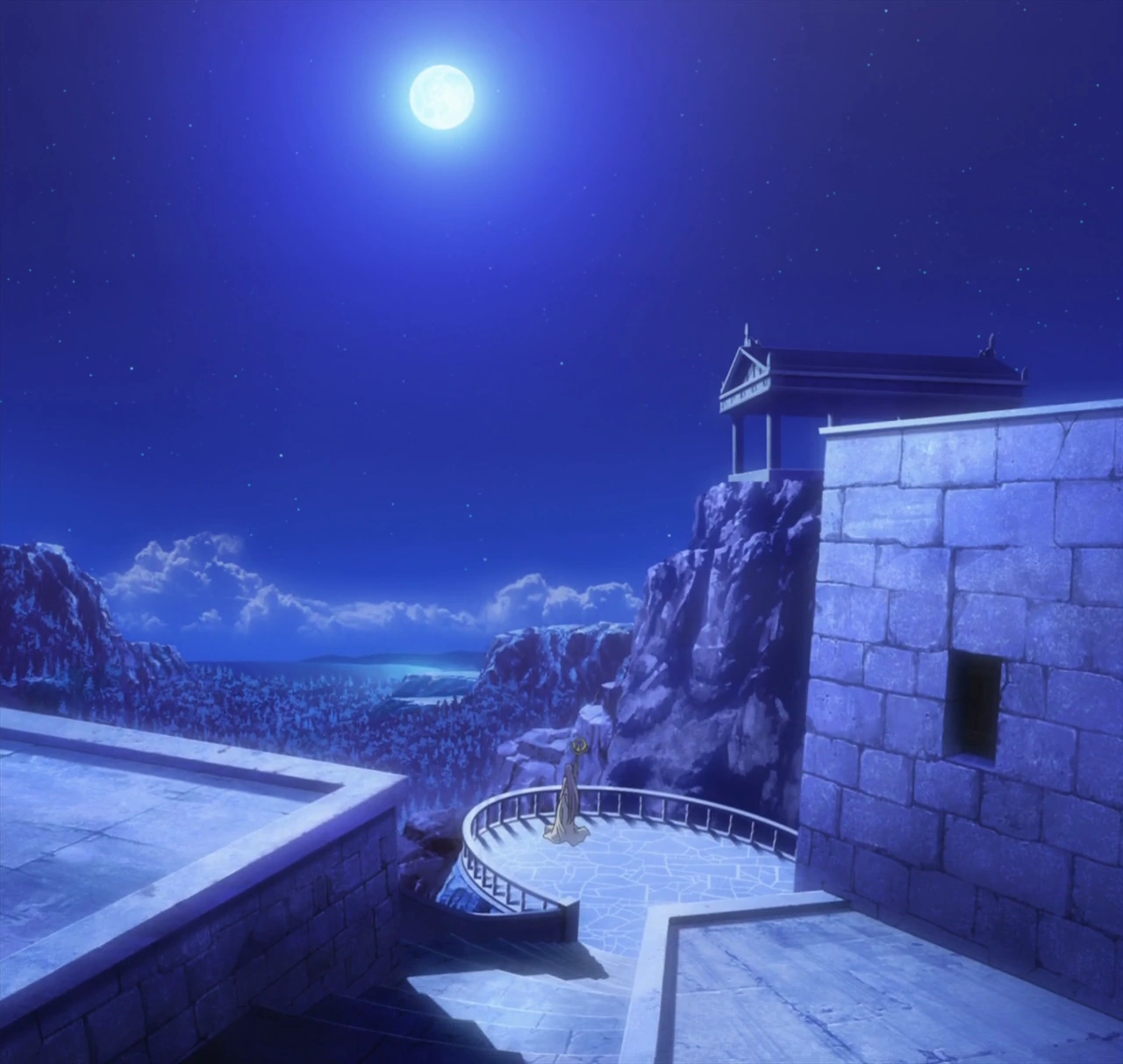 - Templos en Ruinas: La máxima autoridad del Santuario y a la vez representante terrestre de Athena, el Papa, desplegó en su perímetro numerosos campos de fuerza invisibles para así proteger el Santuario de eventuales intrusos que pudieran adentrarse, pues en las afueras y cercana a la costa se encuentra la zona turística, donde se congregan todos los visitantes de los templos griegos en ruinas, posteriores al Ágora, (allí fue donde Aiolos confió a Kido el bebé de Athena) y algunos pueblos de mercaderes, campesinos, ganaderos y artesanos.