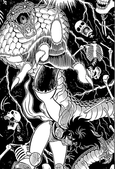 De pronto, Shaina se detiene e indica a Kiki que han venido a darles la bienvenida, lo que sorprende por un momento al pequeño. A continuación, del suelo surgen unos esqueletos armados que rodean rápidamente a ambos. Kiki se asusta y se esconde en la espalda de Shaina, pero Shaina le reprocha de que él ya debería estar acostumbrado de verlos en Jamir. Entonces, Shaina se prepara para combatirlos y los ataca con su Thunder Claw, mientras que Kiki les ataca con rocas mediante la Telequinesis.[1]