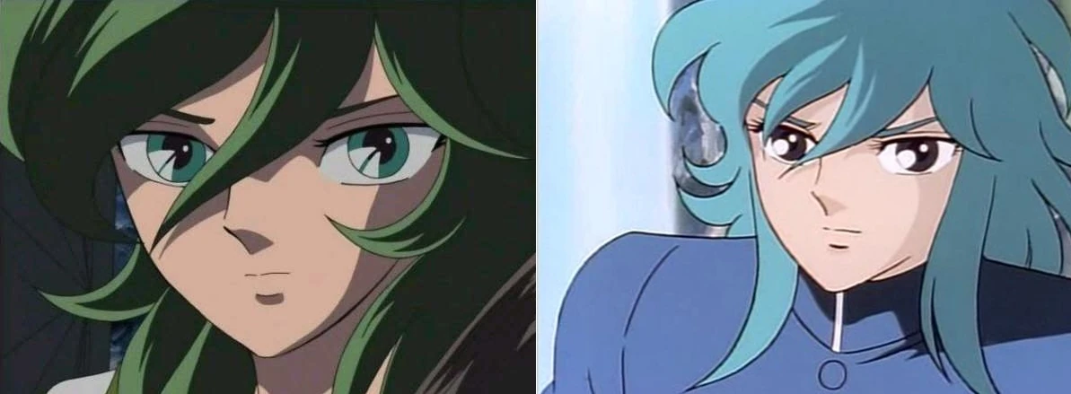 Comparación de Shun y Kirikaze. Ambas son imágenes del anime de Saint Seiya y Fuma no Kojiro respectivamente. Aquí se puede apreciar el gran parecido de ambos.