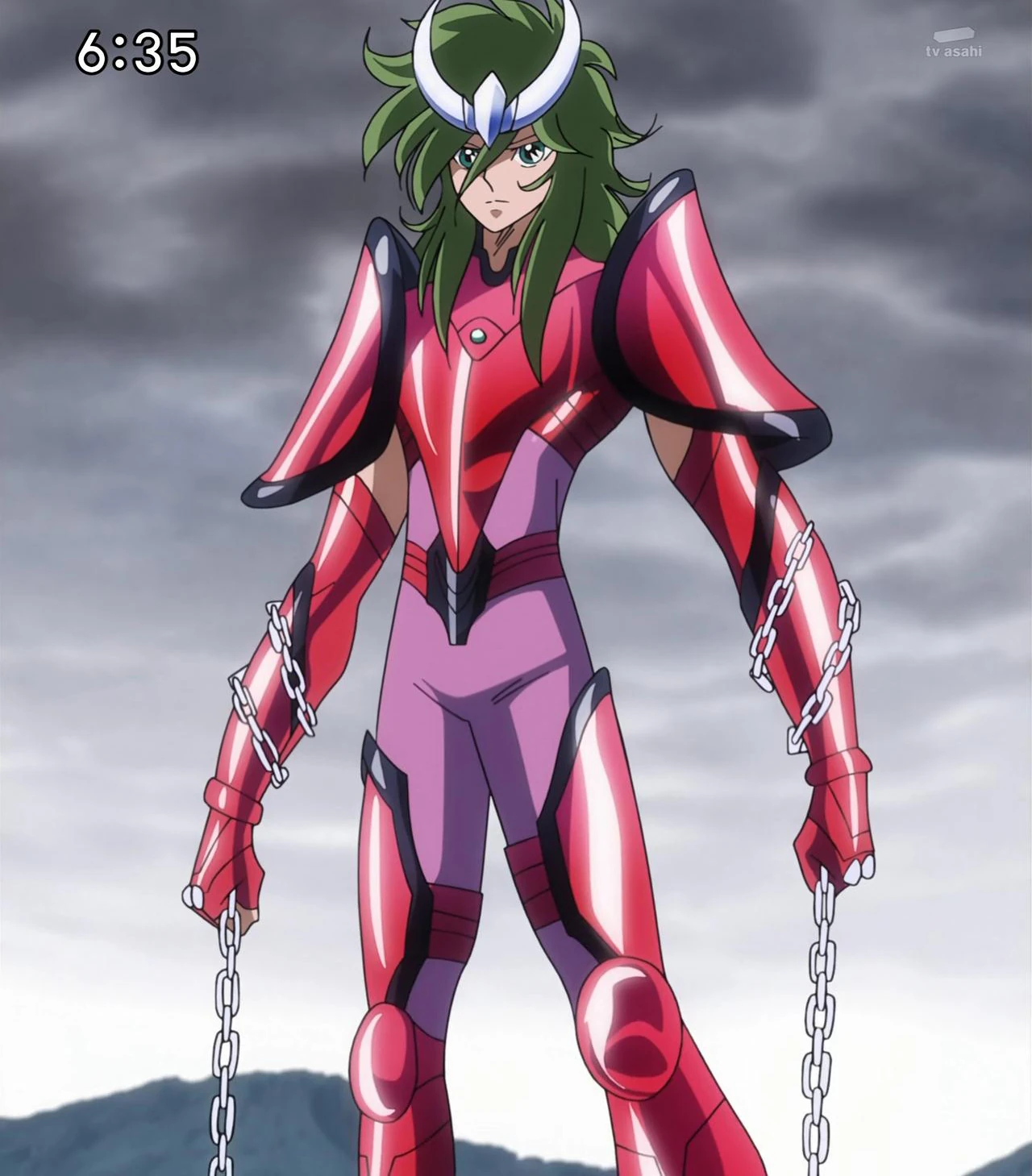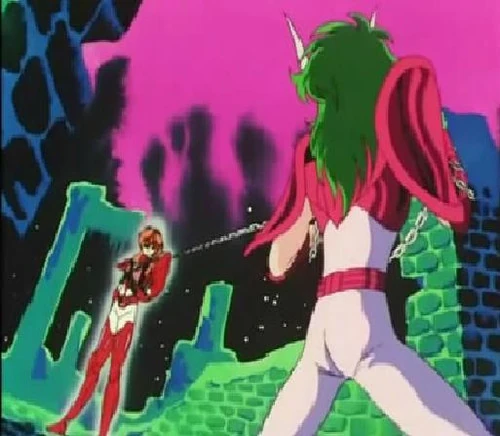 En el anime, lucharía también con Reda y Spica, sus ex compañeros en la Isla Andrómeda. Logró vencer a ambos sin usar su Cloth, solo con pedazos de cadenas de estos Santos y al mismo tiempo le demostró a June que era capaz de pelear en contra de los Santos de Oro.