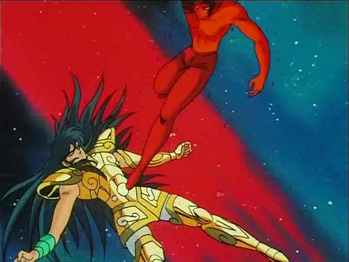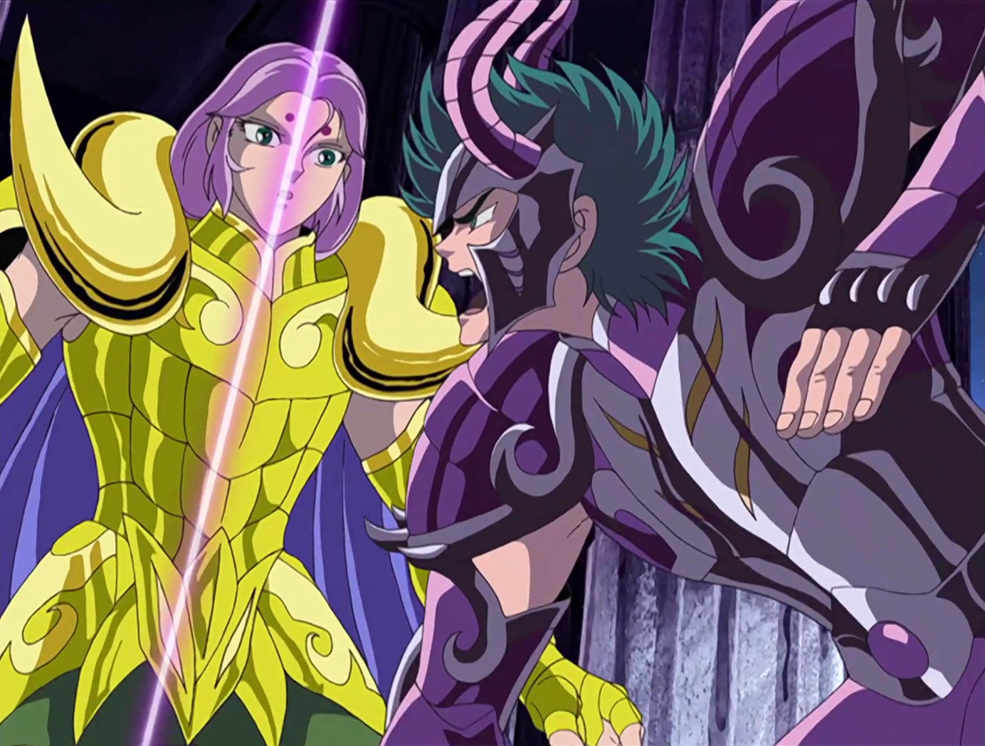 Anime: Se representa la confrontación como ventajosa para Shura debido a que Aiolos quería sobre todo proteger a la bebé Athena.