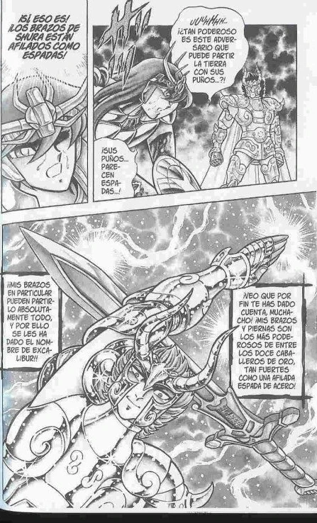 Shura usa Excalibur contra Mu de Aries. Este último escapa teletransportándose.