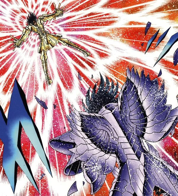 pero con un movimiento de su poderoso brazo el Santo de Tauro lo arroja varios metros lejos del Templo, destruyendo parte del Surplice del Juez y todo el lugar comienza a retumbar. El estruendo producido por el golpe, hace que Shion