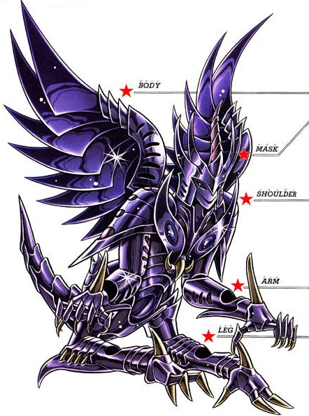 Se trata de una Surplice que cubre la mayor parte del cuerpo del portador. La armadura tiene un tono oscuro, con detalles en azul oscuro y marrón. Del protector del pecho sobresalen dos puntas hasta la altura de las orejas; los protectores de los hombros tienen una caída que llega hasta la mitad del brazo, y en la cintura lleva un protector que, en la forma "Object", simulaba la cola de la Harpía. En las manos y los pies tiene garras, y en la zona de las piernas deja una pequeña área descubierta por debajo de la rodilla. Además, cuenta con dos grandes alas acopladas en la espalda.