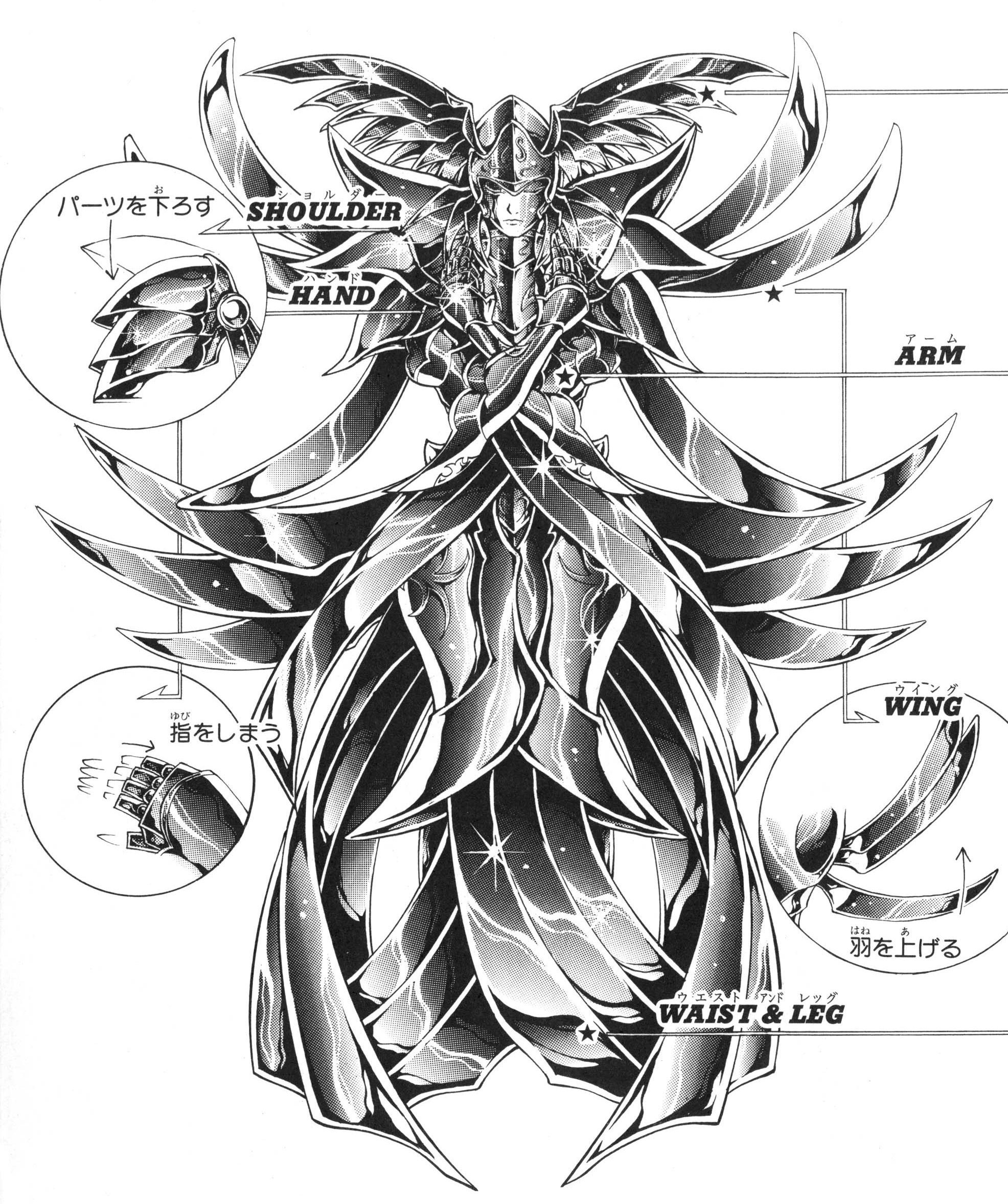 Entre las Armadura es una de las más completas, cubre absolutamente el cuerpo exceptuando la cara. En el casco viene con detalles en forma de alas (detalle común entre las Armaduras de los dioses menores del Sueño). En su espalda tiene 2 pares de alas, los hombros están cubiertos por tres capas de protectores. El pecho tiene detalles en gris y un tono rojizo oscuro, también tiene adornos simulando ser alas. Las piernas son más simples en comparación al resto de la Armadura la cual solo tiene unos detalles en gris y unas alas en los tobillos.