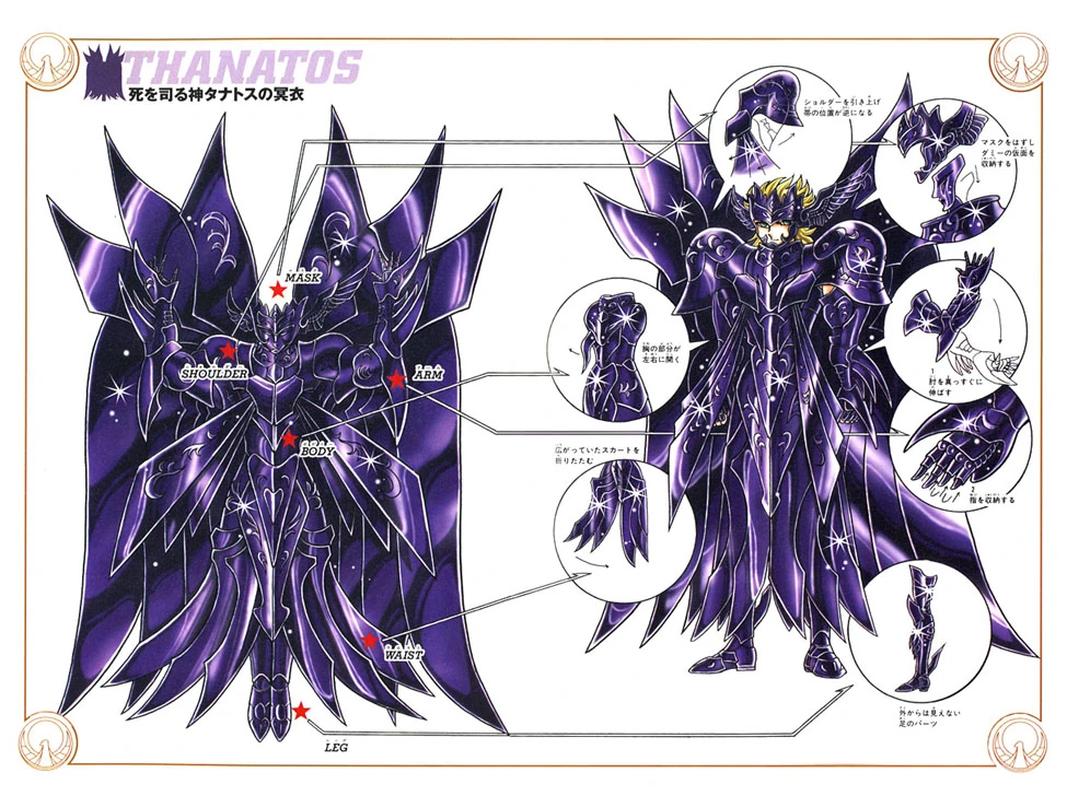 La Surplice de Thanatos es una de las Surplices portadas por los Dioses bajo el domino de Hades, como la mayoría de las Surplices portadas por los Dioses esta suele representar al dios que la porta en este caso a Thanatos.