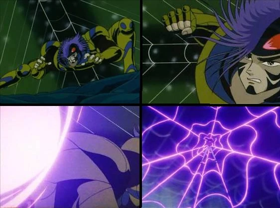 - Aracne, logra atrapar a Seiya, pero el Santo de Acero, Sho, logra absorber el ataque con los ventiladores de su armadura.