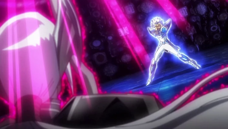 Cuando se prepara para atacarlo, Hyōga detiene el golpe con su Koliso y se enfrenta a él.