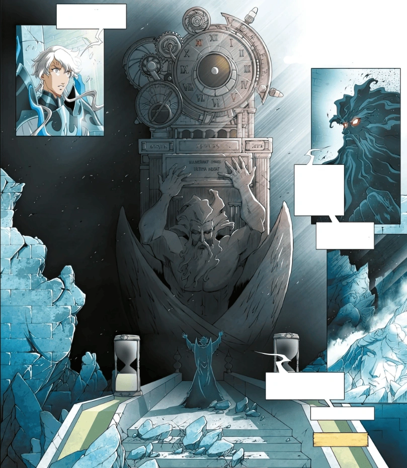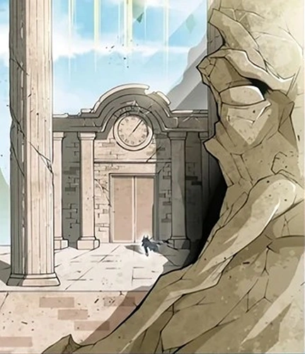 Dès la porte d'entrée passé, il y a un long couloir avec des colonnes cylindriques présentes à certains endroits positionnées de manière symétrique. La base de ces colonnes sont cubique avec des gravures représentant des cadrans d'horloges. Au bout du couloir se trouve une grande pièce lumineuse éclairée par la lumière extérieure. La pièce semble être plus longue que large. À l'entrée de la pièce, se trouve de part et d'autre des morceaux d'amphores fissurées en lévitation desquels s'écoule du sable. Au centre de la pièce se trouve un grand escalier. Deux sabliers y trônent au somme de chacune des rampes. Après celui-ci, on retrouve un gigantesque bas-relief représentant les douze dieux olympiens.[1]