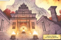Le Temple d’Eukhé présente une architecture symétrique et monumentale. Un escalier central, bordé de deux grands braseros enflammés, mène à une entrée majestueuse encadrée par des colonnes classiques et des murs de pierre finement sculptés, évoquant les temples antiques. À l’intérieur, on retrouve un piédestal circulaire orné de motifs géométriques servant de place de lévitation pour Élétis. Autour de ce socle, quatre petits braseros enflammés sont disposés en cercle, formant une configuration cérémonielle. De manière générale, l’ensemble est baigné dans une lumière dorée, probablement celle du coucher du soleil, ce qui renforce l’atmosphère mystique et sacrée du lieu. Le contraste entre les flammes, les ombres et les reflets confère au temple une aura de solennité intemporelle.