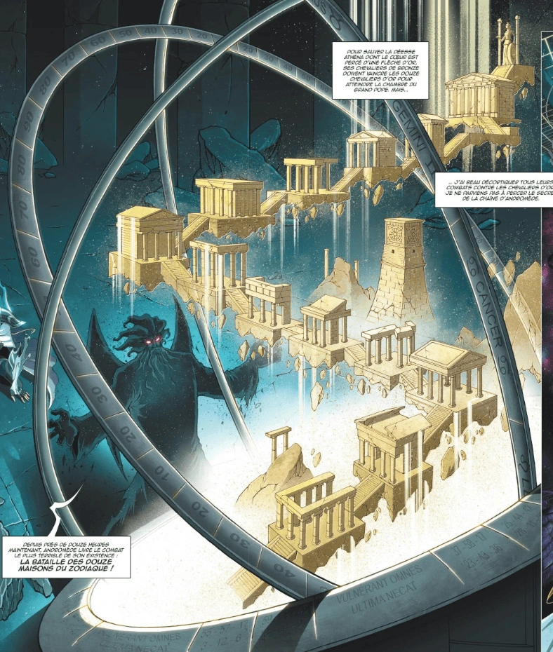 À l'intérieur du temple, se trouve une salle qui abrite une Sphère armillaire, à travers laquelle Chronos peut observer les évènements qui se déroulent dans le monde à ce moment-là. Elle a été utilisée pour observer la Bataille des 12 maisons.[1]
