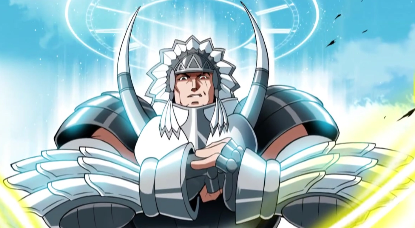 Son aura possède des nuances de gris avec une tête de bison recouvrant le plastron.