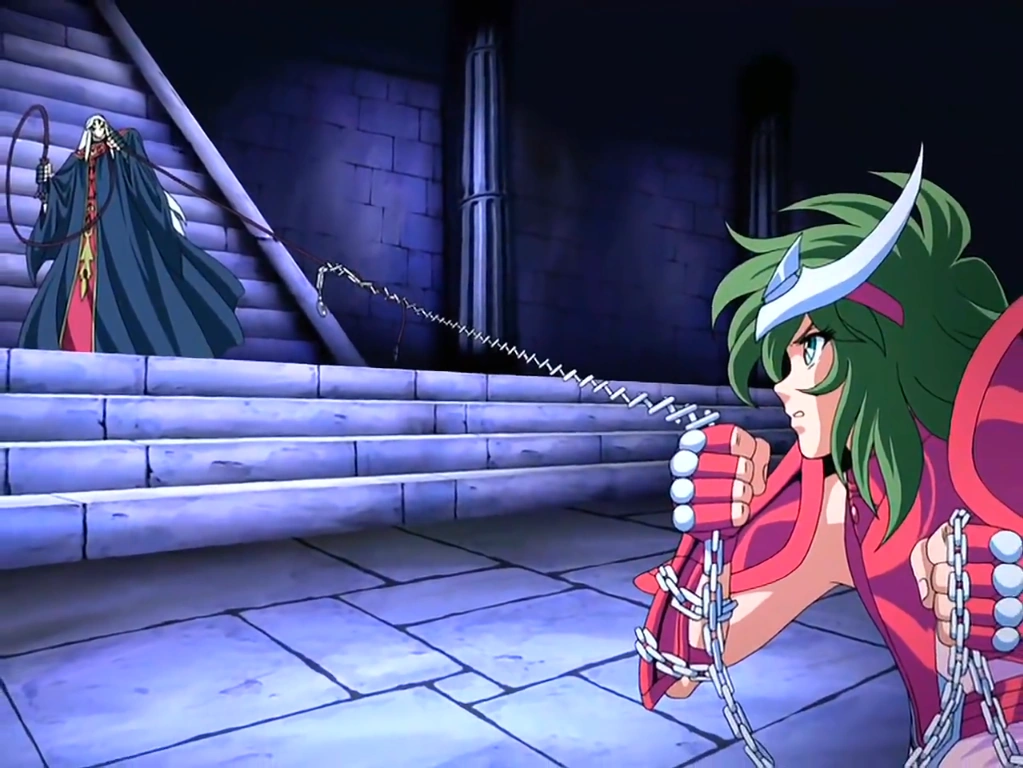 Olhar o rosto do Cavaleiro de Andrômeda provoca sensações de espanto em Lune, porém esse segue com o firme propósito de condenar os Cavaleiros. Lune lança seu chicote que se enrosca na corrente. Shun admite ter lutado e ferido pessoas no passado, mas pergunta a Lune se existia um ser humano que nunca cometera pecados. Lune se limita a dizer que tão somente julga aqueles com base nas leis do Submundo. Shun tenta usar a Defesa Circular, porém o chicote envolve seu corpo e o despedaça.