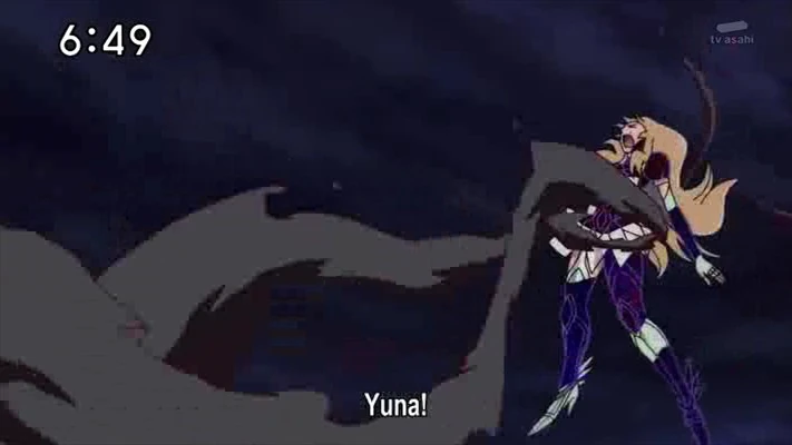 Na Ruína, Yuna usa seu elemento para abrir uma passagem e conseguir entrar nas ruínas, seguida por Kouga. Lá ela é surpreendida por Fly de Mosca, que a deixa imóvel e depois a molesta. Kouga chega e consegue vencer o Cavaleiro de Prata. Aria usa seu poder, junto com o de Yuna, para destruir o núcleo. De sua destruição emerge um Cristal de Cosmo, que garantirá a Yuna um novo poder no futuro.