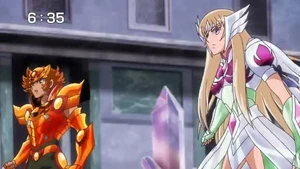 | Nas florestas próximas à Palaestra, Kouga é atacado inesperadamente por uma amazona, Yuna de Águia que o acerta com chutes. Ao vestir a Armadura de Pégaso, ele decide contra-atacar quando é interrompido por Geki de Urso. | ||