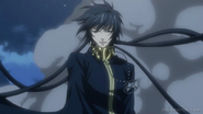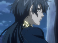 After being possessed by Hades, Alone's facial features mature more. His hair grows longer, and for a while, his hair colour temporarily stays blonde. However, after attacking his hometown and killing Tenma, his hair changes to jet black. Alone's outfit change is very similar to what he wore before his possession, in which his outfit consisted of a longer black coat similar to the style he wore before his possession, his purple belt, which is now longer and wider and tied into a bow, dark pants and dark sandals. He also wears a chain necklace with an ornament shaped into a star with the words "Yours Ever" inscribed in a circle. This was given to him by Pandora.